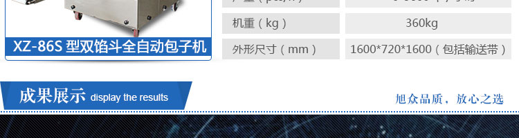 XZ-86S型雙餡斗全自動包子機(jī),可生產(chǎn)各種肉包、肉菜包、菜包、小籠包、湯包、水晶包、圓饅頭、奶黃包、豆沙包、叉燒包、南瓜餅等幾十種包餡制品。適用于賓館、飯店、學(xué)校、機(jī)關(guān)企業(yè)食堂、饅頭或包子加工廠、早餐工程店及速凍食品廠等單位。可滿足不同客戶群體。免費(fèi)提供工藝技術(shù)。免費(fèi)上門培訓(xùn)指導(dǎo)安裝。