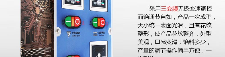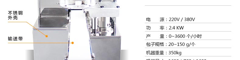 名稱XZ-86型全自動(dòng)包子機(jī) 電源220/380V(見機(jī)器名牌) 功率2.4kw 產(chǎn)量0-3600個(gè)/小時(shí) 尺寸1600*720*1600mm(包括輸送帶) 重量350kg 規(guī)格20-150克/個(gè) 其他
