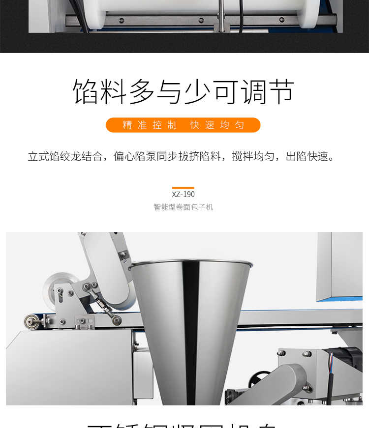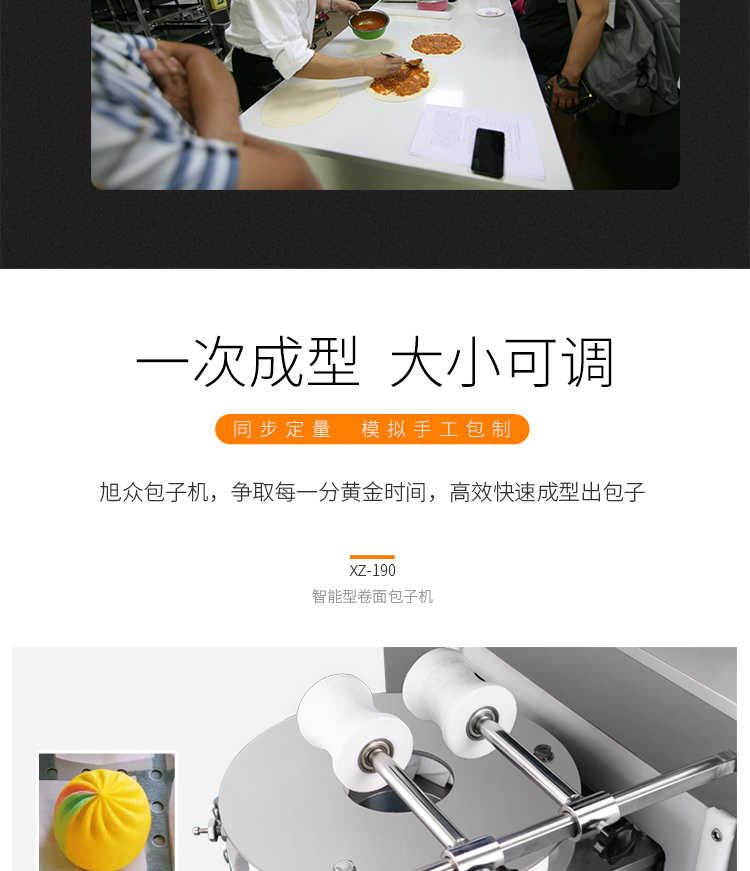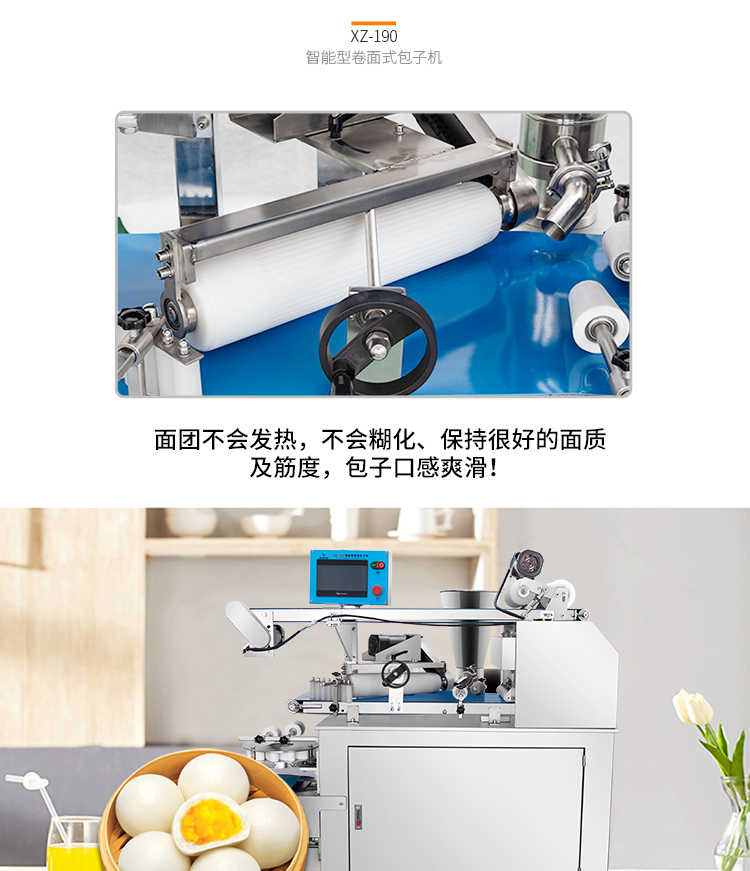XZ-190智能型卷面式包子機(jī),科技和工藝出乎想象不傷面筋,不斷面筋,薄厚調(diào)節(jié)自如可直接調(diào)節(jié)面皮的薄厚,所出產(chǎn)品外形大小統(tǒng)一,遠(yuǎn)比手工制作美觀!