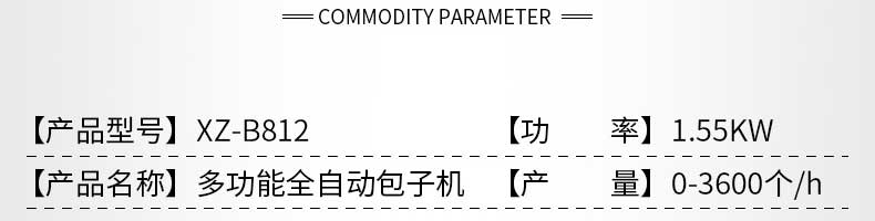 名稱XZ-B812型多功能包子機(jī) 電源220V/380V 功率1.55KW 產(chǎn)量0-3600個(gè)/h 尺寸1540×710×1635mm 重量250kg 規(guī)格25-130g/個(gè) 其他