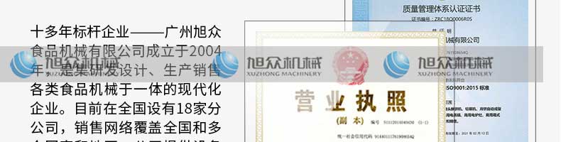 廣州旭眾食品機(jī)械有限公司是一家集科研開發(fā),生產(chǎn)設(shè)計(jì),營(yíng)銷服務(wù)為一體的現(xiàn)代化生產(chǎn)企業(yè)。現(xiàn)代化生產(chǎn)車間,精湛制造技術(shù),所產(chǎn)機(jī)械歷經(jīng)市場(chǎng)重重考驗(yàn),不斷贏得海內(nèi)外客戶的贊譽(yù)。