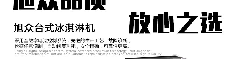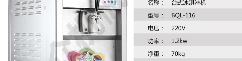 BQL-116臺式冰淇淋機,●選用國際名牌成熟制冷配套件和高效壓縮機,融合旭眾精湛工藝輔以嚴格的質(zhì)量控制流程,使產(chǎn)品整體性能及品質(zhì)得以全面提升?!癫捎萌珨?shù)字電腦控制系統(tǒng),選用名牌優(yōu)質(zhì)電器元件,先進的生產(chǎn)工藝,故障診斷,軟硬任意調(diào)制,自動修復(fù)功能,安全精確,可靠性更高。●專業(yè)成熟制冷系統(tǒng)設(shè)計,選用世界名牌大功率專用壓縮機,大大縮短冰淇淋成型時間,相同時間內(nèi)冰淇淋產(chǎn)量大幅度增加,使您生意火爆時依然得心應(yīng)手,為您創(chuàng)造財富?!癜踩椒€(wěn)的機械攪拌系統(tǒng),噪音更低、振動更小,使整機運行性能達到國際先進水平?!翊_保進料溫度在0°C~35°C;環(huán)境溫度5°C~40°C勻可正常使用。