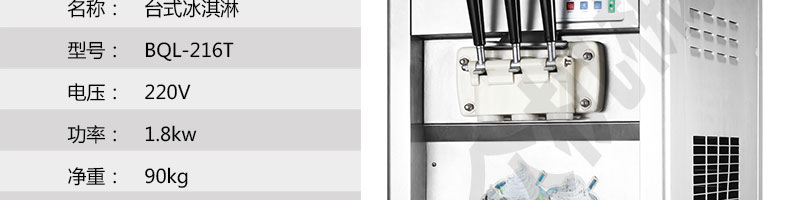 BQL-216T臺式冰淇淋機,●選用國際名牌成熟制冷配套件和高效壓縮機,融合旭眾精湛工藝輔以嚴(yán)格的質(zhì)量控制流程,使產(chǎn)品整體性能及品質(zhì)得以全面提升。●采用全數(shù)字電腦控制系統(tǒng),選用名牌優(yōu)質(zhì)電器元件,先進(jìn)的生產(chǎn)工藝,故障診斷,軟硬任意調(diào)制,自動修復(fù)功能,安全精確,可靠性更高。●專業(yè)成熟制冷系統(tǒng)設(shè)計,選用世界名牌大功率專用壓縮機,大大縮短冰淇淋成型時間,相同時間內(nèi)冰淇淋產(chǎn)量大幅度增加,使您生意火爆時依然得心應(yīng)手,為您創(chuàng)造財富。●安全平穩(wěn)的機械攪拌系統(tǒng),噪音更低、振動更小,使整機運行性能達(dá)到國際先進(jìn)水平?!翊_保進(jìn)料溫度在0°C~35°C;環(huán)境溫度5°C~40°C勻可正常使用。