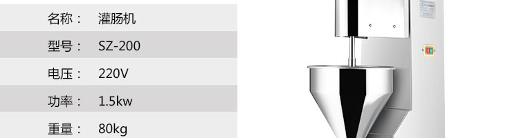 SZ-200灌腸機(jī),適合灌制各種香腸、紅腸、臘腸及糊狀制品。本機(jī)使用敞開式不銹鋼料斗,適用于連續(xù)添加物料;與灌裝手接觸部件全部采用優(yōu)質(zhì)不銹鋼制作以防生銹;該機(jī)自動(dòng)貨程度高,技術(shù)先進(jìn)、性能穩(wěn)定、操作簡(jiǎn)便、工作效率高,具有不破壞物料成份,保質(zhì)、保鮮等特點(diǎn)。