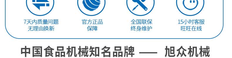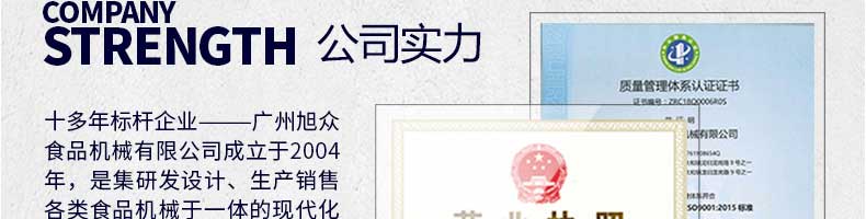 廣州旭眾食品機械有限公司是一家集科研開發(fā),生產(chǎn)設計,營銷服務為一體的現(xiàn)代化生產(chǎn)企業(yè)。現(xiàn)代化生產(chǎn)車間,精湛制造技術(shù),所產(chǎn)機械歷經(jīng)市場重重考驗,不斷贏得海內(nèi)外客戶的贊譽。