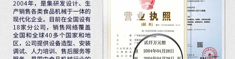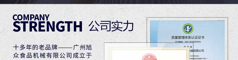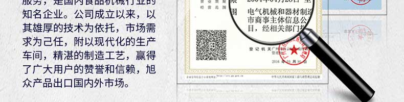 廣州旭眾食品機(jī)械有限公司是一家集科研開(kāi)發(fā),生產(chǎn)設(shè)計(jì),營(yíng)銷服務(wù)為一體的現(xiàn)代化生產(chǎn)企業(yè)?,F(xiàn)代化生產(chǎn)車間,精湛制造技術(shù),所產(chǎn)機(jī)械歷經(jīng)市場(chǎng)重重考驗(yàn),不斷贏得海內(nèi)外客戶的贊譽(yù)。
