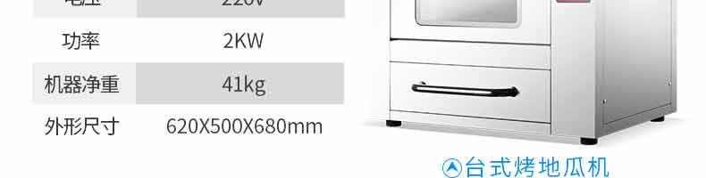 名稱立式烤地瓜機 電源220V 功率3.2KW,2kw 產(chǎn)量 尺寸783*470*1280mm,620*500*680mm 重量70kg,41kg 規(guī)格 其他