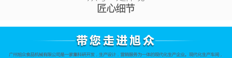 廣州旭眾食品機(jī)械有限公司是一家集科研開發(fā),生產(chǎn)設(shè)計,營銷服務(wù)為一體的現(xiàn)代化生產(chǎn)企業(yè)。現(xiàn)代化生產(chǎn)車間,精湛制造技術(shù),所產(chǎn)機(jī)械歷經(jīng)市場重重考驗(yàn),不斷贏得海內(nèi)外客戶的贊譽(yù)。