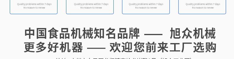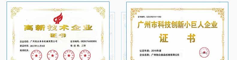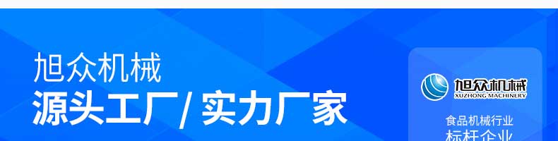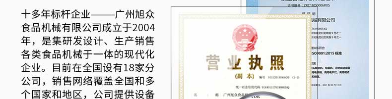 廣州旭眾食品機械有限公司是一家集科研開發(fā),生產設計,營銷服務為一體的現代化生產企業(yè)。現代化生產車間,精湛制造技術,所產機械歷經市場重重考驗,不斷贏得海內外客戶的贊譽。