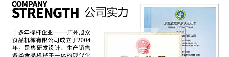 廣州旭眾食品機(jī)械有限公司是一家集科研開(kāi)發(fā),生產(chǎn)設(shè)計(jì),營(yíng)銷(xiāo)服務(wù)為一體的現(xiàn)代化生產(chǎn)企業(yè)?,F(xiàn)代化生產(chǎn)車(chē)間,精湛制造技術(shù),所產(chǎn)機(jī)械歷經(jīng)市場(chǎng)重重考驗(yàn),不斷贏得海內(nèi)外客戶(hù)的贊譽(yù)。