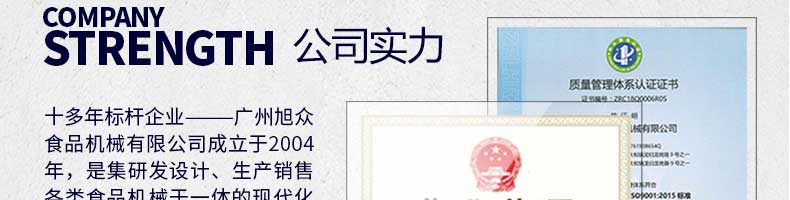 廣州旭眾食品機(jī)械有限公司是一家集科研開發(fā),生產(chǎn)設(shè)計(jì),營(yíng)銷服務(wù)為一體的現(xiàn)代化生產(chǎn)企業(yè)。現(xiàn)代化生產(chǎn)車間,精湛制造技術(shù),所產(chǎn)機(jī)械歷經(jīng)市場(chǎng)重重考驗(yàn),不斷贏得海內(nèi)外客戶的贊譽(yù)。