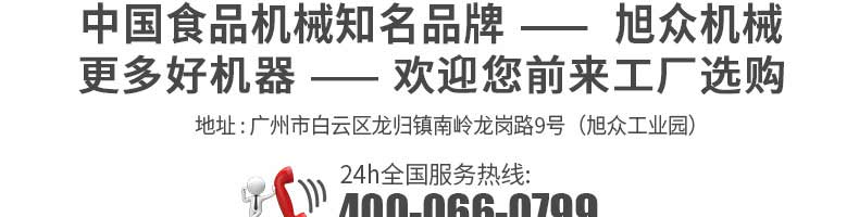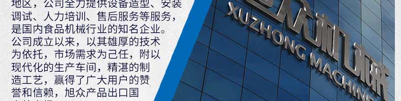 廣州旭眾食品機械有限公司是一家集科研開發(fā),生產(chǎn)設(shè)計,營銷服務(wù)為一體的現(xiàn)代化生產(chǎn)企業(yè)?,F(xiàn)代化生產(chǎn)車間,精湛制造技術(shù),所產(chǎn)機械歷經(jīng)市場重重考驗,不斷贏得海內(nèi)外客戶的贊譽。