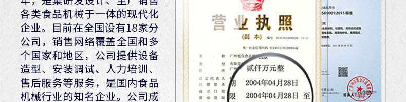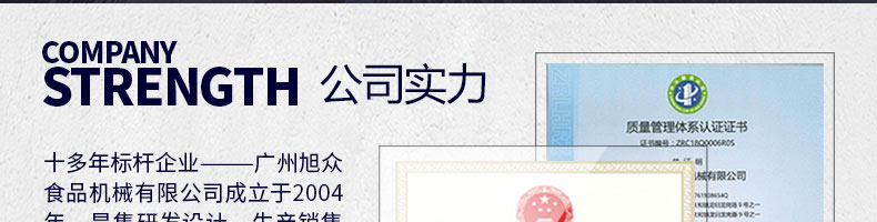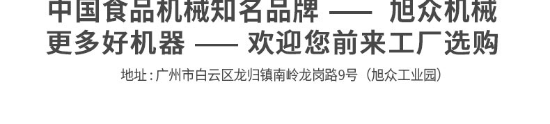 廣州旭眾食品機械有限公司是一家集科研開發(fā),生產(chǎn)設計,營銷服務為一體的現(xiàn)代化生產(chǎn)企業(yè)?,F(xiàn)代化生產(chǎn)車間,精湛制造技術(shù),所產(chǎn)機械歷經(jīng)市場重重考驗,不斷贏得海內(nèi)外客戶的贊譽。