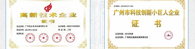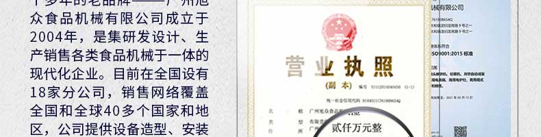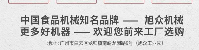 廣州旭眾食品機械有限公司是一家集科研開發(fā),生產設計,營銷服務為一體的現代化生產企業(yè)。現代化生產車間,精湛制造技術,所產機械歷經市場重重考驗,不斷贏得海內外客戶的贊譽。