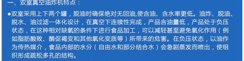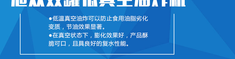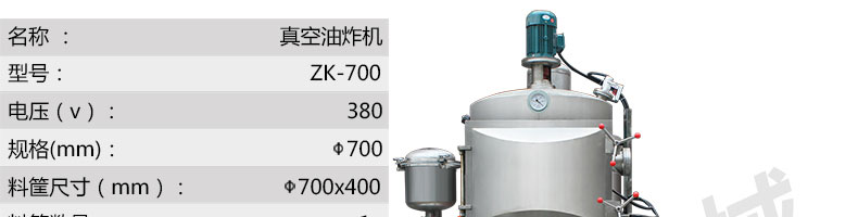 zk-700雙室低溫真空油炸機,適用于水果類、蔬菜類、干果類、水產品機畜禽肉類等。自動控制溫度,無過熱、無過壓,確保產品質量和安全生產。
