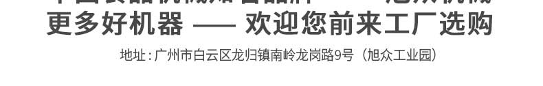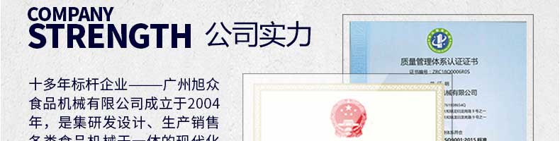 廣州旭眾食品機械有限公司是一家集科研開發(fā),生產(chǎn)設計,營銷服務為一體的現(xiàn)代化生產(chǎn)企業(yè)?,F(xiàn)代化生產(chǎn)車間,精湛制造技術,所產(chǎn)機械歷經(jīng)市場重重考驗,不斷贏得海內外客戶的贊譽。