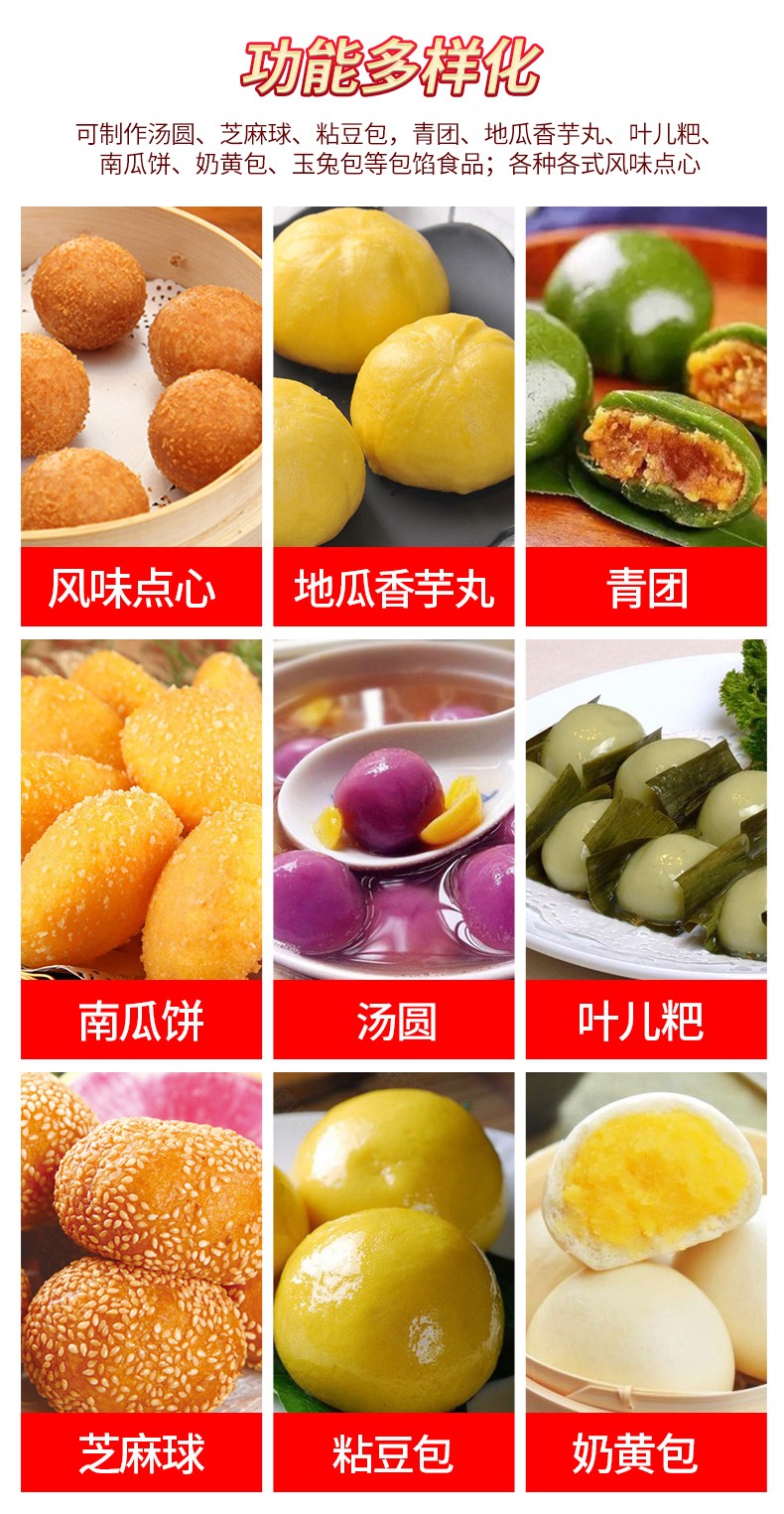 可依外皮及餡料的種類(lèi)不同,可制作湯圓,芝麻球,豆沙包,南瓜餅、奶皇包、含餡饅頭、玉兔包等包餡食品;各種地方風(fēng)味小吃及各式點(diǎn)心。如:東北的粘豆包,江浙滬的青團(tuán),東南部的地瓜丸,香芋丸;西南的葉兒粑等等。