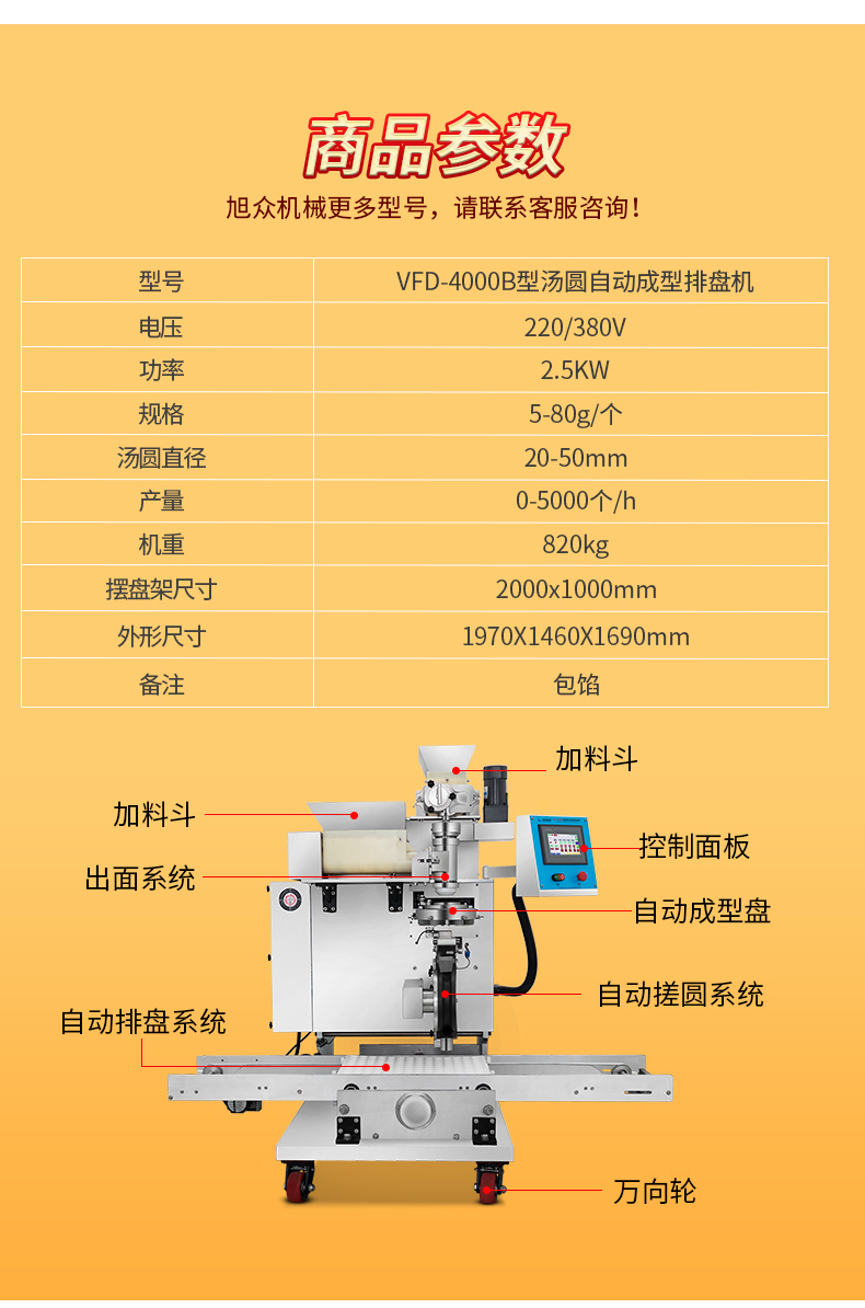 今天給大家介紹一下這款VFD-4000B型湯圓機(jī),為什么要介紹它呢,這款機(jī)械制作多品種食品,關(guān)鍵是產(chǎn)量效率高,1小時(shí)的產(chǎn)量可達(dá)5000個(gè),相當(dāng)于20-30個(gè)工人同時(shí)手工制作湯圓,真正的低投入,高收益,省錢(qián)省工,可制作各式包餡食品,如湯圓、豆沙包、南瓜餅等,是賓館、飯店、企業(yè)、學(xué)校、部隊(duì)等公共食堂和專(zhuān)業(yè)戶理想的面食機(jī)械。